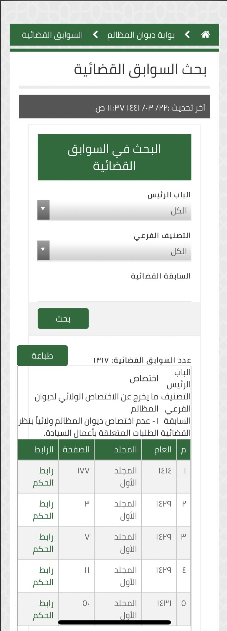 ديوان المظالم المدونات القضائية. أنجز ديوان المظالم إصداره الأول لـ مدونة السوابق القضائية لأحكام الديوان الإدارية من عام 1402هـ حتى عام 1436هـ في 57 مجلد ا. 7 ربيع الثاني 1441. ديوان المظالم يعنى ديوان المظالم بالفصل في مظالم الناس وتحقيق العدالة المنشودة إضافة إلى الرقابة القضائية على الأعمال الإدارية من خلال الدعاوى الموجهة. مجموعة الأحكام والمبادئ الجزائية ديوان المظالم.
