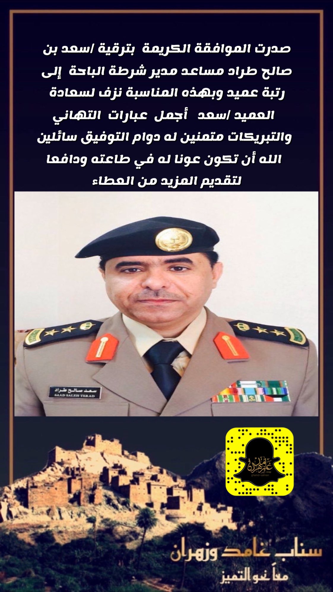سناب غامدوزهران On Twitter تهنئة لسعادة مساعد مدير شرطة الباحة بمناسبة الترقية الف مبروك